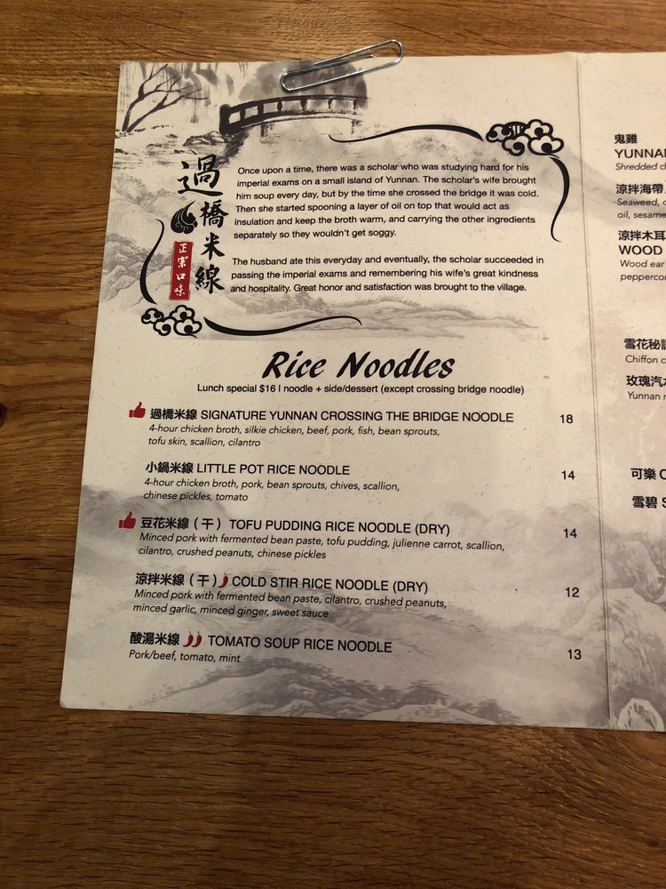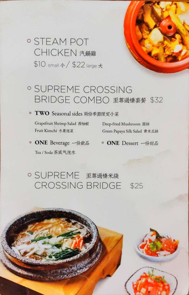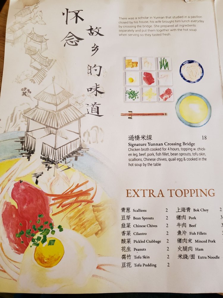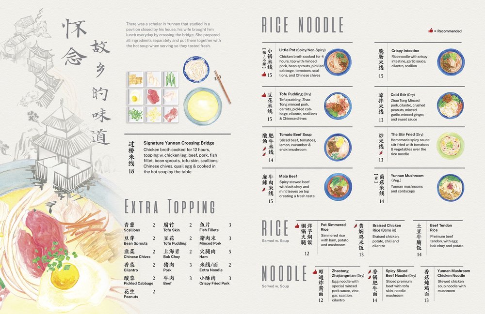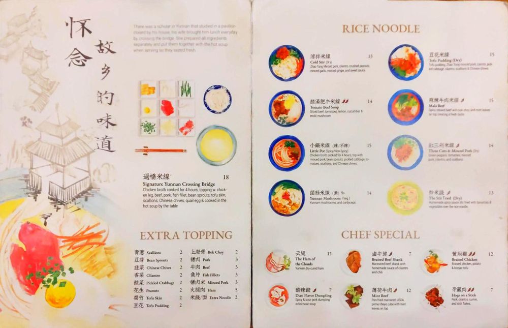 - Signature Yunnan Crossing Bridge Chicken Noodle: A labor of love with an 8-hour broth, accompanied by an array of fresh ingredients.