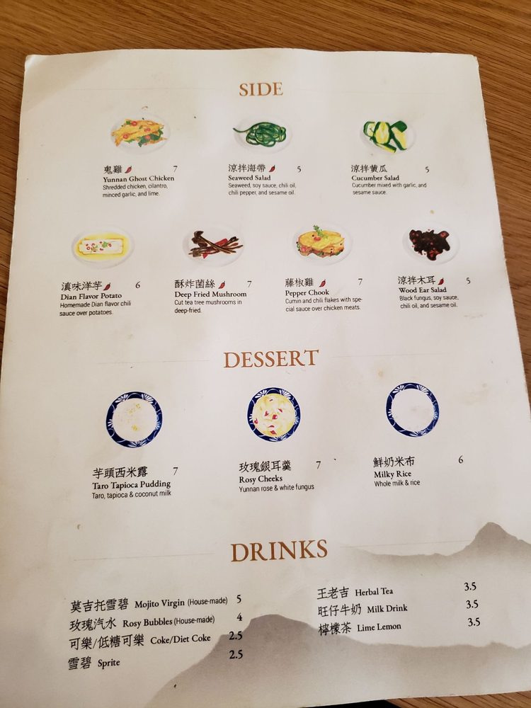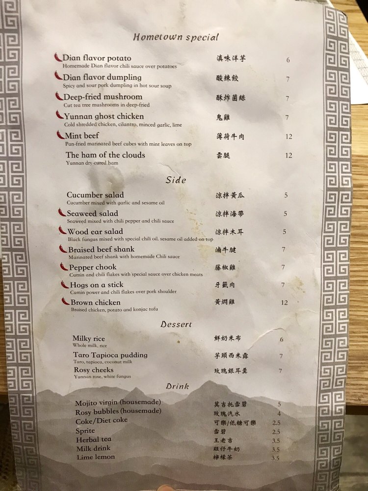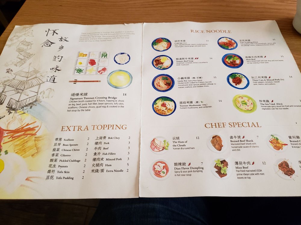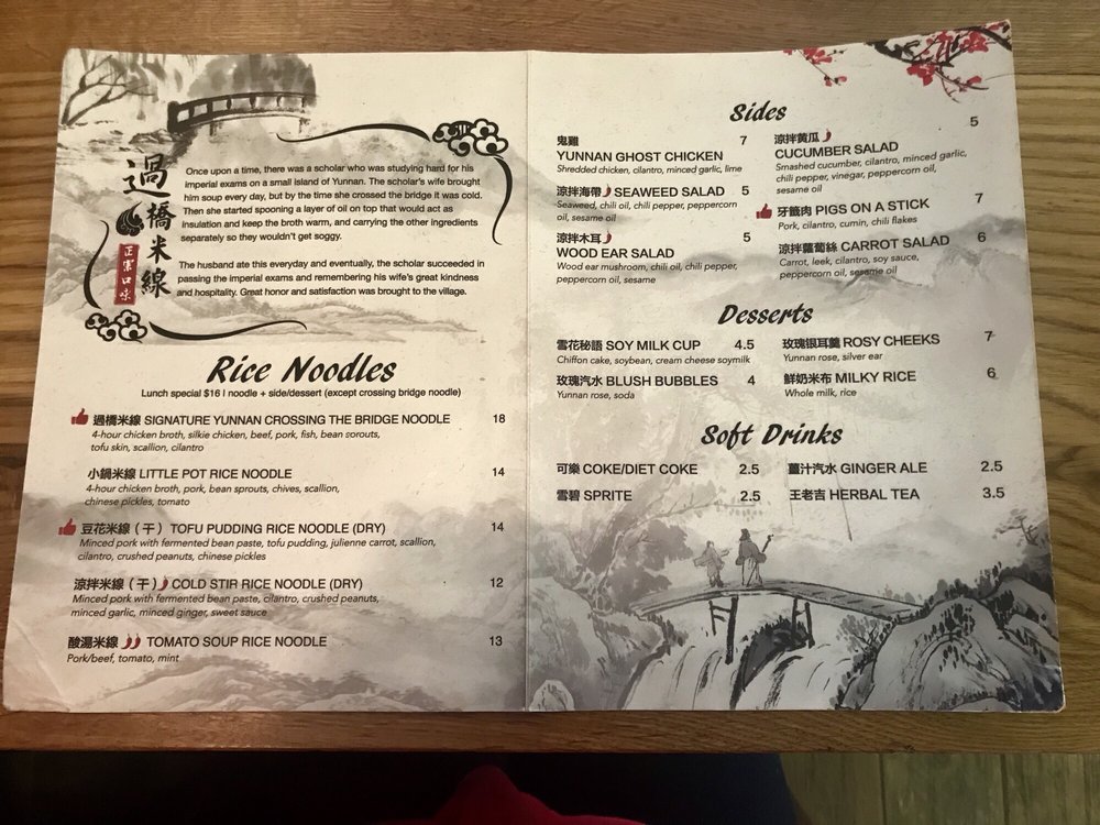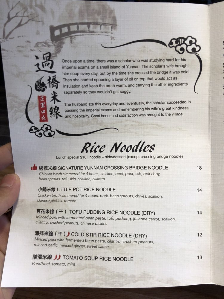 - Signature Yunnan Crossing Bridge Chicken Noodle: A labor of love with an 8-hour broth, accompanied by an array of fresh ingredients.